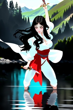 A beautiful and gentle fairy sister holding The hilt of a long sword ,The right hand holds the sword hilt, the hand and arm are naturally bent, and the fingers are in the shape of sword fingers.,her have long black hair, white gauze, White, dewy, smooth breasts,white, tender and silky legs.,She was dressed in white gauze,A white blouse