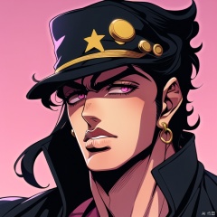 IS_JOJO,1boy, Kujo Jotaro, flesh-colored face, wearing his black hat, black hair, black jacket, pink sky in the background,