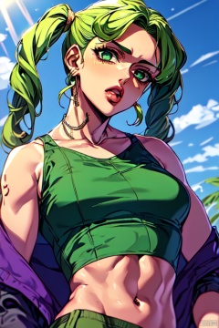 IS_JOJO,1girl, Jolyne Cujoh, jojo no kimyou na bouken, blonde hair,two pigtails, blue eyes, bangs hanging down face, a tattoo on her left arm, a green tight sleeveless top, green leggings, (Flat chest:1.1), green checkered pants, cropped torso upper body, outdoors