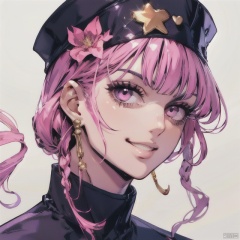 IS_JOJO, 1girl, bangs, closed_mouth, flower, gradient, gradient_background, hair_flower, hair_ornament, light_particles, long_hair, looking_at_viewer, pink_eyes, pink_hair, ribbon, sidelocks, smile, solo, upper_body, white_background, white_flower, white_headwear,