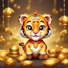 Cartoon version, cute beckoning tiger, zodiac, background blur, gold ingots, festive