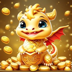 Cartoon version, cute beckoning dragon, zodiac, background blur, gold ingots, festive