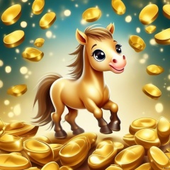 Cartoon version, cute beckoning horse, zodiac, background blur, gold ingots, festive