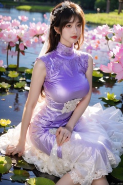 masterpiece,1girl,(mature female:0.5),tall body,full body,golden proportions,(Kpop idol),(shiny skin:1.2),(oil skin:1.1),makeup,(close up),depth of field,(closed mouth:0.5),((long wavy brown hair)),(puffy eyes),(eyelashes:1.1),(parted lips:1.1),red lipstick,fantasy art style,dreamy light,(high neck purple wedding dress:1.59),(purple long wedding dress:1.39),(lace:1.49),perfect body,(dreamy veil:1.3),(dusk:1.2),(princess shoes:1.1),(diamond necklace),(crystal hairpin),tyndall effect,highres,(Sitting on the grass by the river:1.56), (lotus pond full of lotus flowers:1.59), (big breasts:2),(Flowers:1.69)