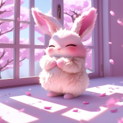 maotu, rabbit, rabbit focus, soft lighting, white fur, whimsy and dramatic lighting, warm colors, mf-movie-filter, cc-color-correction, cute, whiskers, :3, ^ ^, light particles, sunlight, no humans, window, closed eyes, solo, indoors, cherry blossoms, fluffy, petals, day, full body, blush, standing, closed mouth, shadow, blurry, pink background, spring \(season\), own hands together, facing viewer<lora:maotu_v1:0.8>,