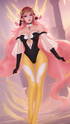 (1girl),smooth chin,masterpiece,detailed face,((hair ornament:1.6)),top quality,4k,make up,best quality,(detached sleeves),(medium breasts),blush,body blush,<lora:王者虞姬无限倾慕_v1.0:0.9>,(full body,long legs),black gloves,full bvody highleg leotard,yellow pants,white see-through sleeves,white mixed black edge clothes,(white bra),pink eyes,bare shoulders,headgear,