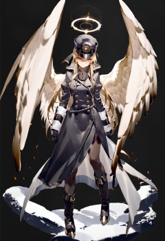masterpiece, best quality, 1girl , hat, solo, long hair , fire, boots , halo, red eyes, gloves, looking at viewer, blonde hair, black headwear, uniform, chain , military uniform, black footwear, military, black gloves, full body, fur trim, military hat, dress, wings, black dress, black background <lora:REIKOXLlokr8f:1>