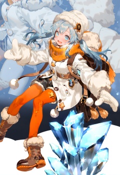 masterpiece, best quality, long hair, 1girl, open mouth, very long hair, thighhighs, hat, blue eyes, fur trim, smile, ice, orange thighhighs, shorts, boots, solo, bangs, long sleeves, mittens, scarf, :d, bag, white hair, white headwear, crystal, twintails, black footwear, star \(symbol\), coat, sparkle, winter clothes, looking at viewer, black shorts, white coat, fur-trimmed sleeves, blush, zoom layer, white jacket <lora:REIKOXLlokr8f:1>