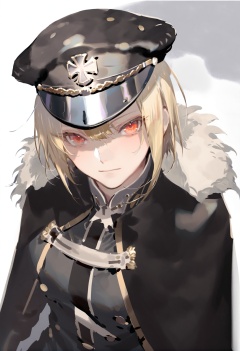masterpiece, best quality, 1girl, hat, blonde hair, solo, red eyes, peaked cap, looking at viewer, fur trim, hair between eyes, black headwear, upper body, short hair, jacket, cape, bangs, uniform, military uniform, military, military hat, crossed bangs, iron cross  <lora:REIKOXLlokr8f:1>