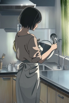 ((HRD, HUD, 8K)),((masterpiece, best quality)), highly detailed, soft light,1girl, solo, kitchen, cooking, short hair, apron, stove, black hair, kettle, sink, faucet, ladle, food, cup, bob cut, steam, indoors,<lora:20240421-1713705200913:0.8>