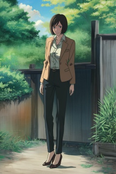 ((HRD, HUD, 8K)),((masterpiece, best quality)), highly detailed, soft light,1girl, solo, short hair, black hair, brown hair, bob cut, blue eyes,jacket, brown jacket, school uniform, plant, high heels, full body, long legs, standing, looking at viewer,<lora:20240421-1713705200913:0.8>
