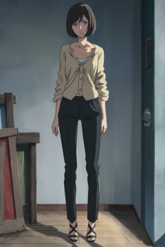 ((HRD, HUD, 8K)),((masterpiece, best quality)), highly detailed, soft light,1girl, solo, short hair, black hair, brown hair, bob cut, blue eyes,collarbone, pants, toenails, full body, long legs, standing, looking at viewer,<lora:20240421-1713705200913:0.8>