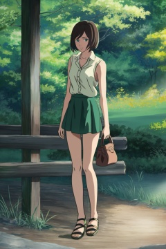 ((HRD, HUD, 8K)),((masterpiece, best quality)), highly detailed, soft light,1girl, solo, short hair, black hair, brown hair, bob cut, blue eyes,shirt, sleeveless, green skirt, sleeveless shirt,skirt, sandals, full body, long legs, standing, looking at viewer,<lora:20240421-1713705200913:0.8>