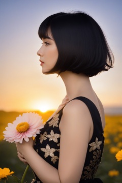 1girl, solo, short hair, black hair, dress, flower, profile, sunset