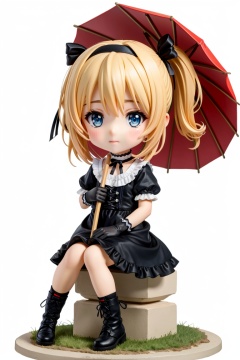 ((HRD, HUD, 8K)),((masterpiece, best quality)), highly detailed, soft light,chibi, big eyes, big head, 1girl, blonde hair, umbrella, choker, ribbon, solo, black choker, gloves, hairband, sitting, side ponytail, blue eyes, short hair, leg ribbon, hair ribbon, single glove, boots, tress ribbon, full body, looking at viewer, dress, simple background, white background,
