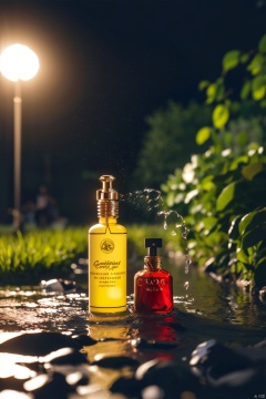 Cosmetic commercial posters,A cinematic photograph of a bottle of perfume conatins a lowers and small tropical fish inside at creek, sunrise in background, firefly surrounded outside,(water splashing:1.2),