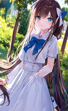 masterpiece,8k,best quality,1girl,solo,((depth of field)),bowknot,long hair,light,white ribbon,outdoors,smile