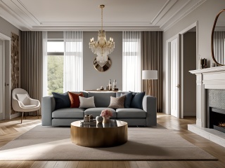 living room,French style,no humans,scenery,indoors,couch,table,pillow,carpet,mirror,French carving,window,chair,wooden floor,curtains,book,rug,chandelier,lamp,door,French lines,