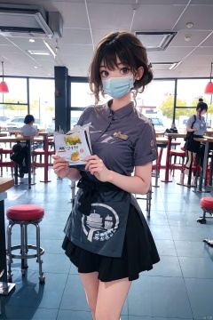 masterpiece,best quality,realistic,1girl, solo, looking at viewer, bangs, skirt, brown hair, shirt, black hair, holding, standing, short sleeves, food, collared shirt, indoors, black skirt, uniform, black eyes, apron, mask, chair, table, pink shirt, mouth mask, tiles, waitress, tile floor, employee uniform, shop, ceiling, restaurant, menu