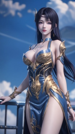 1girl, hair ornament, jewelry, long hair, braid, purple eyes, earrings, blue dress, bare legs, mischevious smile, perfect body, scenery, sharp focus, best quality, masterpiece, detailed outfit, illustration, perfect eyes, finely detailed beautiful anime eyes, realistic skin, intricate details, best lighting, depth of field, ultra high resolution,cowboy_shot, dynamic pose, dynamic angle,