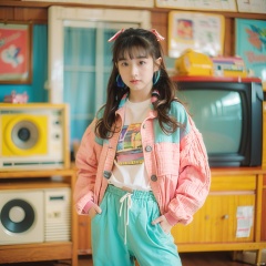 ((Masterpiece)), ((Best Quality)),80sDBA style, little girl,solo, looking at viewer, bangs, brown hair, shirt, long sleeves, ribbon, twintails, brown eyes, standing, jacket, hair ribbon, pants, blunt bangs, blurry, cosplay, blurry background, blue jacket, hands in pockets, pink pants