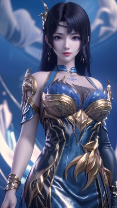 1girl, hair ornament, jewelry, long hair, braid, purple eyes, make_up, earrings, blue dress, mischevious smile, perfect body, scenery, sharp focus, best quality, masterpiece, detailed outfit, illustration, perfect eyes, finely detailed beautiful anime eyes, realistic skin, intricate details, best lighting, depth of field, ultra high resolution,cowboy_shot, dynamic pose, dynamic angle,