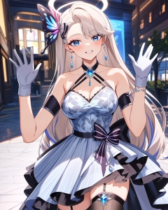 ray tracing,highres absurdres,masterpiece,bestquality,higher quality,best quality,blush,aesthetic,very aesthetic,best quality,hight quality,hight,vision,newest BREAK <lora:nailin-asoul-a3a:0.6>,1girl,blue eyes,solo,long hair,breasts,thighhighs,butterfly hair ornament,layered skirt,asymmetrical bangs,grey gloves,looking to the side,bow,halterneck,halo,garter straps,blue jewelry,hair behind ear,argyle dress,white hair,waving,looking_at_viewer,smile,