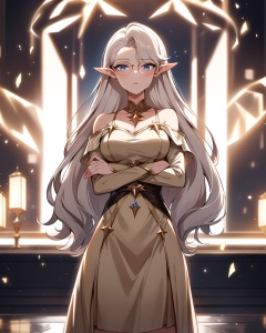 very aesthetic,aesthetic,masterpiece,bestquality,higher quality,best quality,Volumetric Lighting,moody lighting,Cinematic Lighting,looking_at_viewer,blush,arms_crossed,cowboy_shot,solo,glasses,<lora:nailin-asoul-a3a:0.6>,1girl,blue eyes,long hair,asymmetrical bangs,white hair,hair behind ear,pointy ears,golden off-shoulder dress,blindfold,elf,robe,