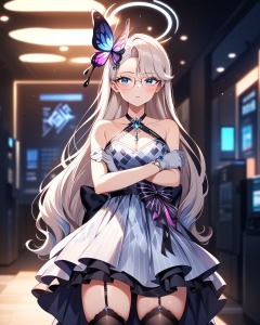 very aesthetic,aesthetic,masterpiece,bestquality,higher quality,best quality,Volumetric Lighting,moody lighting,Cinematic Lighting,looking_at_viewer,blush,arms_crossed,cowboy_shot,solo,glasses,<lora:nailin-asoul-a3a:0.6>,1girl,blue eyes,long hair,asymmetrical bangs,white hair,hair behind ear,thighhighs,butterfly hair ornament,layered skirt,grey gloves,bow,halterneck,halo,garter straps,blue jewelry,hair behind ear,argyle dress,