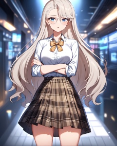 very aesthetic,aesthetic,masterpiece,bestquality,higher quality,best quality,Volumetric Lighting,moody lighting,Cinematic Lighting,looking_at_viewer,blush,arms_crossed,cowboy_shot,solo,glasses,<lora:nailin-asoul-a3a:0.7>,1girl,blue eyes,long hair,asymmetrical bangs,white hair,hair behind ear,plaid, shirt, white socks, white shirt, plaid skirt, loafers,brown footwear, yellow bow, collared shirt, pleated skirt, yellow bowtie, school uniform