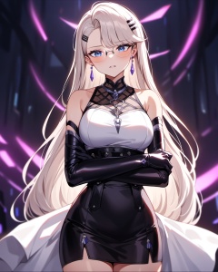very aesthetic,aesthetic,masterpiece,bestquality,higher quality,best quality,Volumetric Lighting,moody lighting,Cinematic Lighting,looking_at_viewer,blush,arms_crossed,cowboy_shot,solo,glasses,<lora:nailin-asoul-a3a:0.6>,1girl,blue eyes,long hair,asymmetrical bangs,white hair,hair behind ear,purple earrings,hairclip,high-waist skirt,elbow gloves,white cloth,
