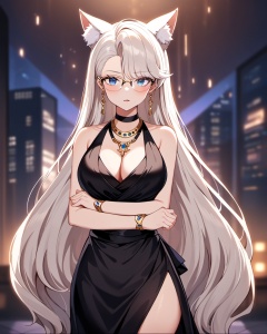 very aesthetic,aesthetic,highres absurdres,masterpiece,bestquality,higher quality,best quality,Volumetric Lighting,moody lighting,Cinematic Lighting,blush,arms_crossed,cowboy_shot,solo,<lora:nailin-asoul-a3a:0.6>,1girl,blue eyes,long hair,asymmetrical bangs,white hair,hair behind ear,yellow necklace,looking at viewer,cleavage,black dress,black evening gown,black choker,large breasts,bare shoulders,very long hair,animal ear fluff,animal ears,glasses