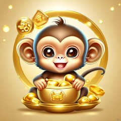 Cartoon version, cute beckoning monkey baby, zodiac, background blur, gold ingots,
