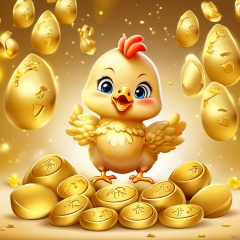 Cartoon version, cute beckoning baby chicken, zodiac, background blur, gold ingots,