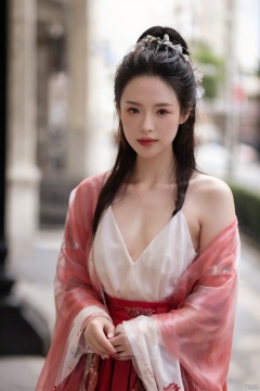 Surrealist beauty photo, a beautiful woman wearing complex and detailed colored clothes and future jewelry, low cut., Zhangziyi, hanfu