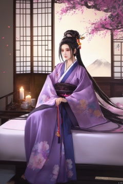 1girl, solo, long hair, black hair,Hairpins,necklace, hair ornament, dress, full body, flower, earrings, indoors, hair bun, (purple dress),(Tube top Hanfu long skirt:1.1), pillow, bed, night, chinese clothes, table, branch,(huge breasts:1.69), (full breasts:1.59)