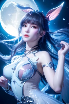 (8k, RAW photo, best quality, masterpiece:1.2), (super realistic, photo-realistic:1.3), ultra-detailed, extremely detailed cg 8k wallpaper, hatching (texture), skin gloss, light persona, (crystalstexture skin:1.2), (extremely delicate and beautiful), ultra-high resolution, (photo realistic: 1.4), Surrealism, Fantastical verisimilitude, beautiful blue-skinned goddess Phoenix Peacock on her head, fantastical creation, thriller color scheme, surrealism, abstract, psychedelic, 1 girl, flower,(translucent white gauze dress:1.3), (moon), moonlight, water surface, long hair, windy, qingyi, ll-hd, pf-hd, ty-hd,rabbit ears,animal_ears