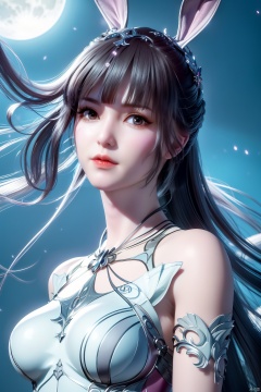(8k, RAW photo, best quality, masterpiece:1.2), (super realistic, photo-realistic:1.3), ultra-detailed, extremely detailed cg 8k wallpaper, hatching (texture), skin gloss, light persona, (crystalstexture skin:1.2), (extremely delicate and beautiful), ultra-high resolution, (photo realistic: 1.4), Surrealism, Fantastical verisimilitude, beautiful blue-skinned goddess Phoenix Peacock on her head, fantastical creation, thriller color scheme, surrealism, abstract, psychedelic, 1 girl, flower,(translucent white gauze dress:1.3), (moon), moonlight, water surface, long hair, windy, qingyi, ll-hd, pf-hd, ty-hd,rabbit ears,animal_ears