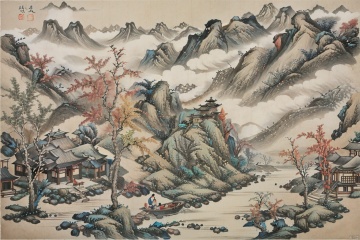 Chinese style ink landscape painting, trees, mountains, rivers, huts, boats, gf
