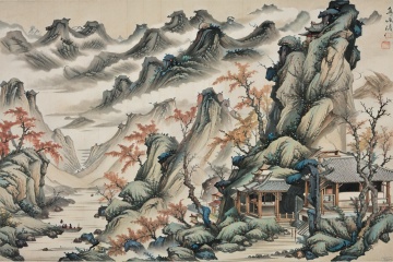 Chinese style ink landscape painting, trees, mountains, rivers, huts, boats, gf