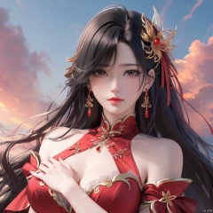 1girl, solo, long hair, breasts, looking at viewer, black hair, hair ornament, dress, jewelry, upper body, earrings, sky, red dress, hand on own chest, MeiDuSa, JHJH, xinyue