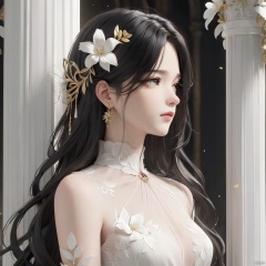 1girl, solo, long hair, black hair, hair ornament, dress, jewelry, closed mouth, upper body, flower, earrings, white dress, clothing cutout, expressionless, pillar