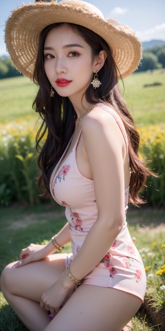 (Canon RF85mm f/1.2,best quality,Realisticity:1.4,Cinematic Lighting),(1 girl,korean mixed,kpop idol:1.2,beautiful long_Slender_legs),(long_brown_wavy_hair),(lipstick,red lips,pink_shiny_lips,pink_eyeshadow,eyelashes,powder_blusher,make-up),(white_shiny_skin,black eyes,Pore,skin texture,shiny),(necklace,earrings,bracelet),big breasts,smile,Dynamic pose,((A peaceful meadow with wildflowers and a rainbow, A powerful and emotionally resonant love story)),((Floral_printed_romper,Straw_wide-brim_hat)),
