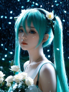 breathtaking face focus, masterpiece, best quality, 1girl, hatsune miku, white roses, petals, night background, fireflies, light particle, solo, aqua hair with twin tails, aqua eyes, standing, pixiv, depth of field, cinematic composition, best lighting, looking up . award-winning, professional, highly detailed