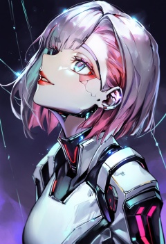 masterpiece, best quality,1girl, lucy \(cyberpunk\),  solo, looking up, black background, short hair, bangs, signature, parted lips, cyborg, portrait, blue eyes, cyberpunk, makeup, looking away, high collar, gradient background, red lips, smile, science fiction, upper body, jacket, monowire, light particles, purple background, white jacket, pink hair, thick eyebrows, red eyeliner, wire, eyeliner, asymmetrical bangs, multicolored hair, green hair, orange background, grey hair <lora:COCOballXLlokr8f-000123:0.95>