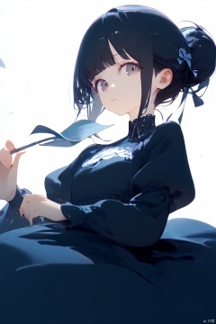 score_9, score_8_up, score_7_up, score_6_up, 1girl, solo, hair bun, single hair bun, black hair, white background, looking at viewer, dress, simple background, parted lips, ribbon, holding, black dress, spot color, long sleeves