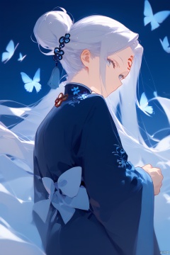 score_9, score_8_up, score_7_up, score_6_up, 1boy, solo, male focus, bug, butterfly, forehead mark, long hair, facial mark, upper body, looking back, chinese clothes, from behind, looking at viewer, flower, hanfu, profile, grey hair, sideways glance, robe, long sleeves, ponytail, hair pulled back, eyelashes, very long hair, closed mouth, white hair, hair bun