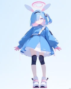 score_9, blue skirt, short hair, one side up, pink eyes, white hairband, pink gloves, skirt, shoes, long sleeves, blue shirt, blue hair, hairband, white background, white footwear, halo, looking at viewer, multicolored hair, rabbit ears, solo, two-tone skirt, hair over one eye, animal ears, closed mouth, smile, full body, gloves, shirt, knee pads, white skirt, standing, pink hair, simple background, streaked hair, black hairband, blue eyes