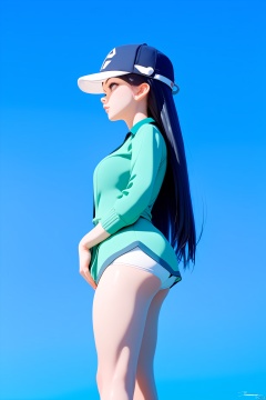(score_9_up,score_8_up),professional 3d model ((Asian girl with the word 'sheeny' on her baseball cap)), (profile), from the Side below, black hair, long hair, green shirt, Blue background, simple background, lineart, partially colored, (chibi), Extreme, . octane render, highly detailed, volumetric, dramatic lighting,(score_9_up,score_8_up),