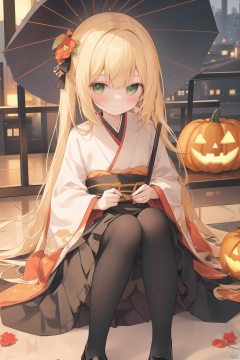 chen_bin,(best quality), (masterpiece), 1girl, solo, umbrella, long_hair, blonde_hair, oil-paper_umbrella, sitting, socks, japanese_clothes, jack-o'-lantern, blush, holding_umbrella, hair_ornament, shoes, holding, kimono, wide_sleeves, flower, hair_flower, looking_at_viewer, long_sleeves, kneehighs, black_skirt, skirt, black_footwear, bangs, green_eyes, black_socks, mary_janes, frilled_socks, frills, closed_mouth, halloween, two_side_up, pumpkin, lantern